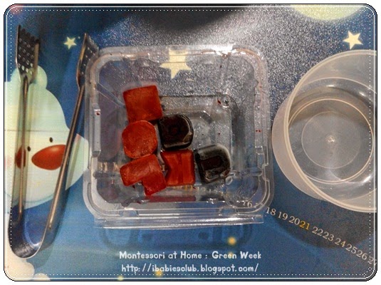 I found these chopstick(which are presents from friends) during i tidy up my drawer and came out with this idea. Using chopstick require great dexterity and strong fine motor skills, but my intention was just let her to try out on this.
